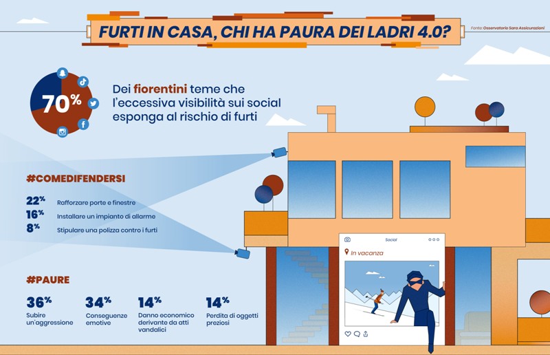 Come rivela infatti l’ultima ricerca dell’Osservatorio Sara Assicurazioni, ben tre fiorentini su quattro (70%) temono che un’eccessiva visibilità sui social network possa esporre la propria casa a un maggior rischio di furti e per questo ritengono che occorra fare un uso accorto e consapevole di queste piattaforme, evitando di condividere, specie pubblicamente, troppe informazioni su di sé.