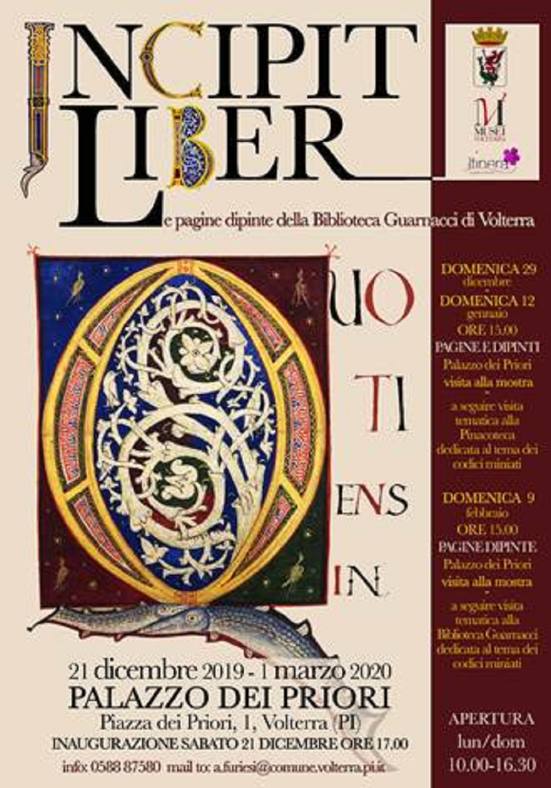 Si intitola “Incipit liber – Le pagine dipinte della Biblioteca Guarnacci di Volterra” la mostra che aprirà i battenti il 21 dicembre (inaugurazione alle 17,00) presso il Palazzo dei Priori a Volterra.