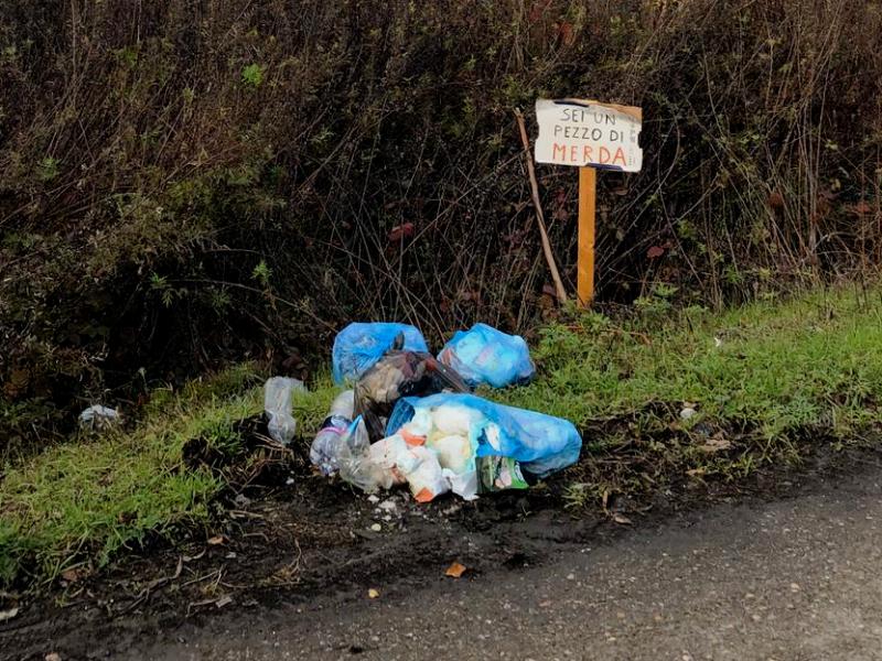 Nella foto, scattata in via Adamello al Pozzale, frazione di Empoli, si vede un cumulo di rifiuti lasciati sul ciglio della strada e un cartello, con una scritta offensiva: "Sei un pezzo di m***a".
