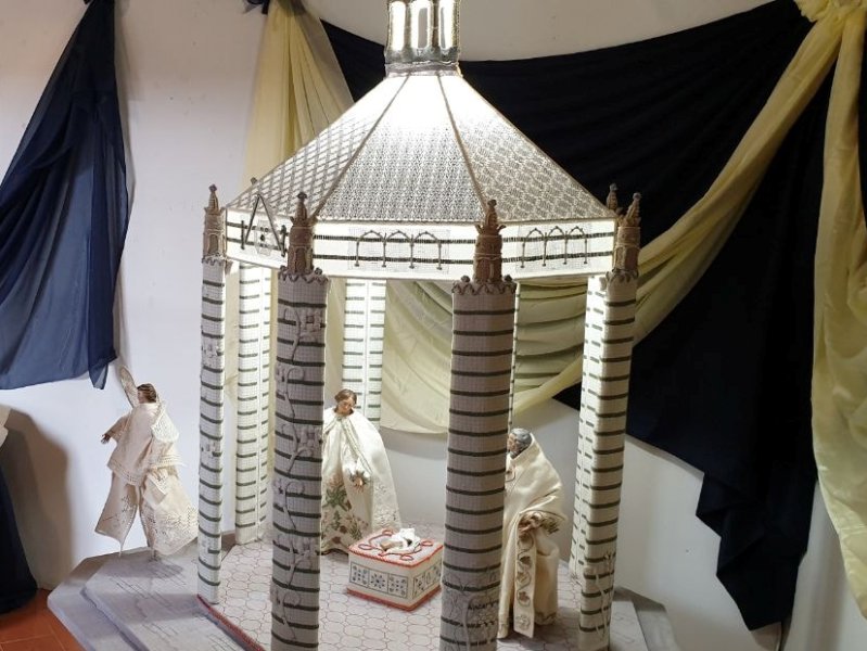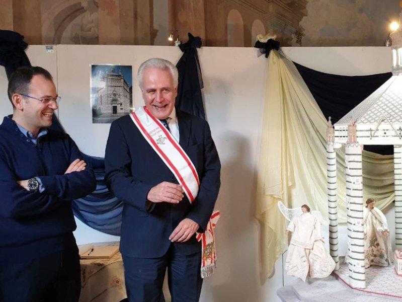 Una realizzazione che ha richiesto mesi di lavoro e progettazione – la capanna è ispirata dal battistero di Pistoia; le vesti dei personaggi a particolari autentici delle opere della cattedrale -: un allestimento ‘in scala’ (le colonne, il sistema elettrico di illuminazione), poi ‘rivestito’ e interpretato con i contributi a ricamo delle donne depositarie dell’arte antica, riscoperta e trasmessa a Casalguidi,  oggi riunite per l’inaugurazione nella sala Fetonte di palazzo del Pegaso.