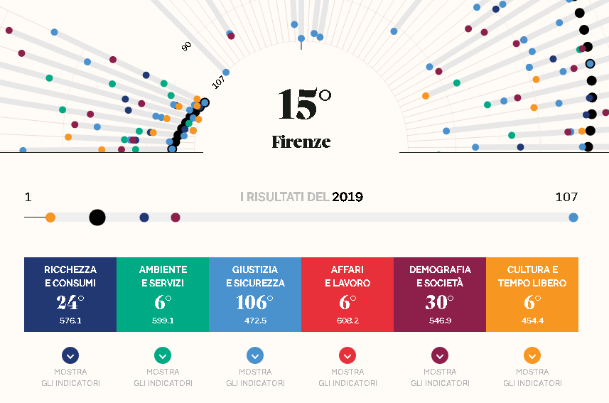 Tra le province, troviamo Prato al 27° posto, Siena al 35°, Pisa al 41°, Arezzo al 42°, Livorno al 47°, Lucca al 54°, Pistoia al 59°, chiudono Massa-Carrara al 71° e Grosseto al 79°