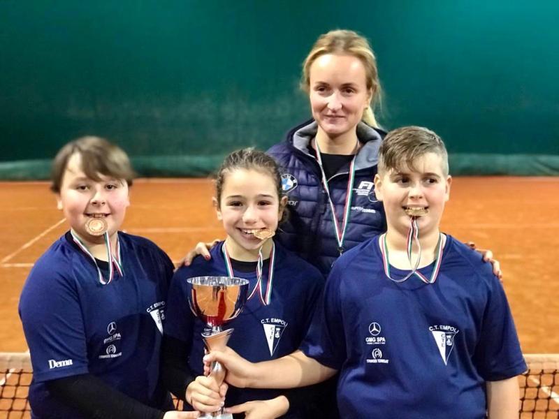 Favoloso dono natalizio per i giocatori più piccoli del Circolo Tennis Empoli. I biancazzurri delle classi 2009, ’10 e ’11 hanno conquistato il titolo toscano del Super Orange misto nella finale a quattro disputata sui propri campi di via Vacchereccia. Gli allievi dei maestri Mario Brogi e Irene Avellino si sono imposti in un campionato dove erano iscritte 39 società e, nella partita cruciale, hanno piegato il Certaldo 2/0. I punti sono stati intascati da Matteo Paci, col 6-3 centrato nel suo incontro, e da Giulia Cerrini, protagonista di un grande recupero con cui ha prevalso 7-6 sulla rivale valdelsana. Nella semifinale con Livorno ‘A’, i tennisti del club empolese avevano ottenuto il pass per la sfida decisiva 2/1 grazie ai successi in singolare di Giulia Cerrini e di Matteo Paci; pertanto la sconfitta del doppio misto Giulia Cerrini-Lorenzo Vivio era risultata irrilevante. Dal canto suo, Certaldo aveva guadagnato la finalissima dominando Livorno ‘B’. Il trionfo degli atleti-ragazzini è stato impreziosito dalla vittoria della squadra maschile limitata 3.4 sul Pisa nel campionato invernale. Con le loro prove, Andrea Magherini in singolare e ancora Magherini con Paolo Marini in doppio, hanno permesso al team di accedere nel tabellone regionale.