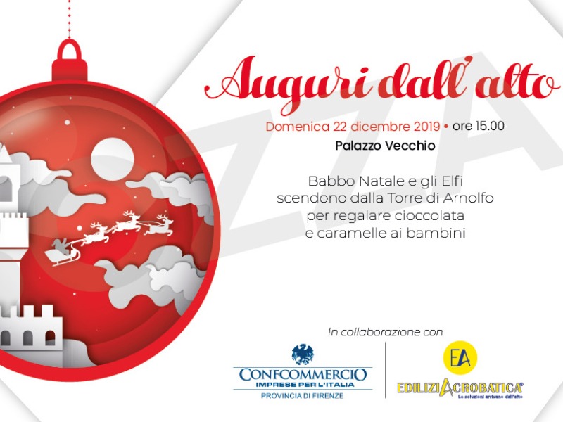 Su iniziativa del Comune di Firenze e di Confcommercio e con la collaborazione di EdiliziAcrobatica, domenica 22 dicembre alle ore 15 Babbo Natale e gli elfi acrobatici scendono dalla Torre di Arnolfo per regalare cioccolata e caramelle ai bambini. L’appuntamento è in piazza della Signoria, nei pressi della Torre di Arnolfo di Palazzo Vecchio: tutti i bambini che lo desidereranno potranno assistere al suggestivo spettacolo di un vero Babbo Natale che, con i suoi aiutanti, scenderà dall’alto agganciato a una fune, esattamente come ogni giorno fanno i tecnici acrobati impegnati in lavori di ristrutturazione e riqualificazione sulle case e i palazzi di tutta Italia e ricevere proprio dalle sue mani dolci e piccoli regali.