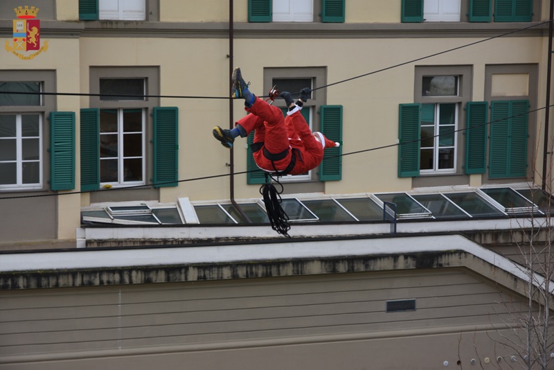 Questa mattina la Polizia di Stato ha portato i suoi auguri ai piccoli degenti dell’ospedale pediatrico Meyer di Firenze e lo ha fatto a modo suo: gli agenti del reparto Speciale della Polizia di Stato, noto con l’acronimo NOCS, si sono travestiti da Babbo Natale per un giorno e si sono calati dai tetti con sacchi pieni di doni.