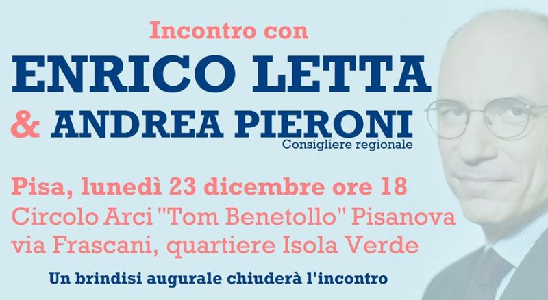 Enrico Letta sarà a Pisa lunedì 23 dicembre dalle ore 18 presso il circolo Arci Tom Benetollo di Pisanova nel quartiere di Isola verde (via Frascani, a fianco del Cinema). Ad annunciarlo il consigliere regionale Pd Andrea Pieroni, che annualmente organizza l’appuntamento pre-natalizio con l’ex Presidente del Consiglio. Attualmente Enrico Letta insegna all’università Science Po di Parigi dove dirige la Scuola di Affari Internazionali ed è fondatore della Scuola di politiche che forma le nuove generazioni di politici e amministratori in tutta Italia. “Sarà un momento per riflettere insieme sull’attualità politica e per fare un brindisi di auguri prima della pausa natalizia insieme ad Enrico”, afferma Pieroni.