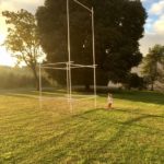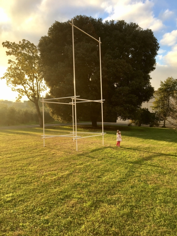 Un'enorme sedia fatta di tubi Innocenti nel prato della Villa