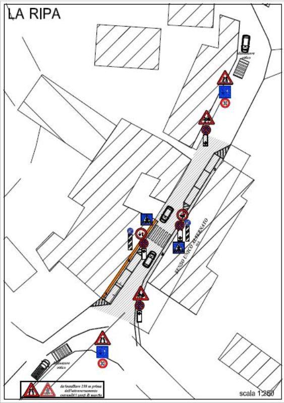Per La Ripa sarà prevista anche la fresatura di un tratto di asfalto e la stesura di un nuovo tappeto d'usura con una colorazione tipo marrone/beige, di migliore impatto nei borghi. Attraverso segnaletica orizzontale, attraversamenti pedonali, cuspidi non carrabili, sensi di marcia alternati, nuovi limiti di velocità, l'obiettivo dell'Amministrazione è quello di rendere quanto più possibile percepibile agli automobilisti l'attraversamento dei nuclei abitati di questi due borghi.