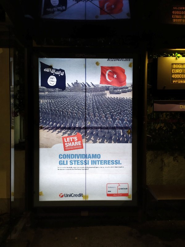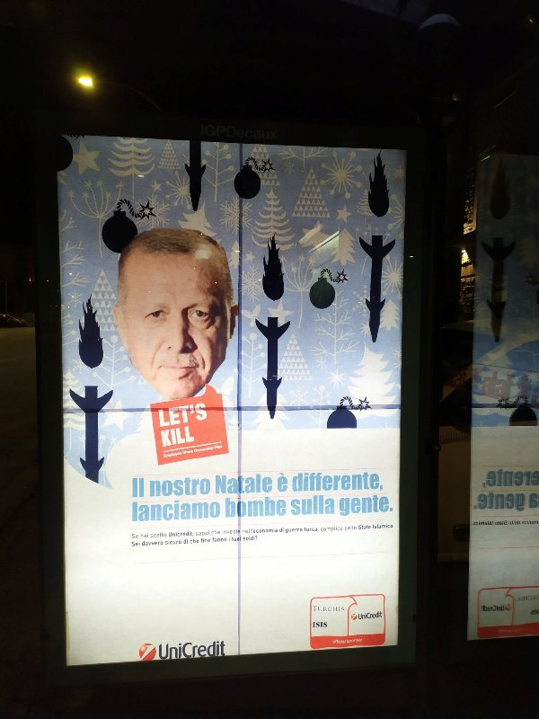 È scattato stamane il 'subvertising' contro la Turchia di Erdogan alle fermate dei bus di Firenze. Il 'subvertising' cioè la vandalizzazione crativa che si contrappone al classico 'advertising', cioè la pubblicità.