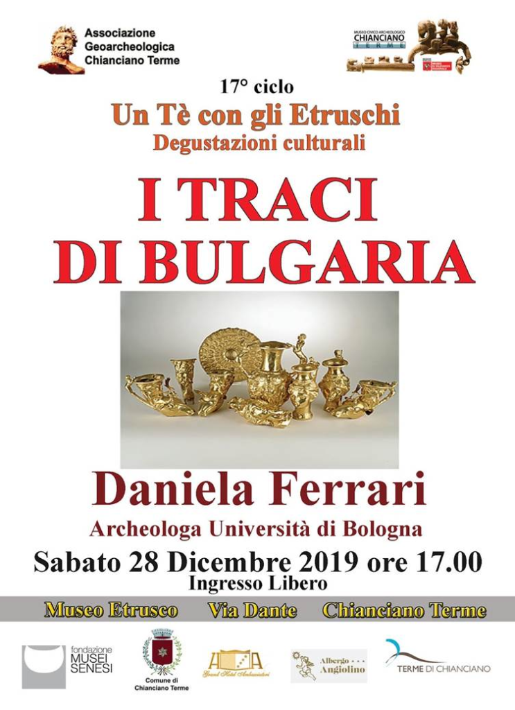 Sabato 28 dicembre 2019 alle ore 17 ultimo appuntamento del 2019 al Museo Civico Archeologico di Chianciano Terme, nell’ambito del 17° ciclo di incontri “Un tè con gli Etruschi”, sarà ospite Daniela Ferrari, Archeologa dell’Università degli Studi di Bologna, che terrà una conferenza sul tema "I Traci di Bulgaria".
