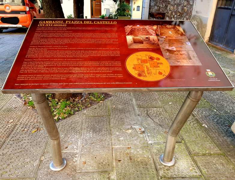 Sette secoli di piazza del Castello a Gambassi Terme rappresentanti un un pannello a cura dell'amministrazione comunale e realizzato dall'associazione archeologica della Valdelsa Fiorentina. A illustrarlo su Facebook la vice sindaco Sara Rigacci e il primo cittadino Paolo Campinoti. I cambiamenti tra il 1400 e il 1900 circa sono ben illustrati, raccontando anche dei resti della fornace da vetro di epoca preindustriale ritrovati durante i lavori degli anni '90. Le ceramiche e i vetri che sono stati recuperati sono visibili presso la Mostra Permanente del Vetro situata nel Palazzo Comunale a lato della biblioteca. Il pannello è invece sul lato di via Gonnelli.