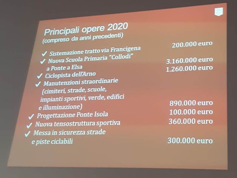 Alcune cifre sono state annunciate alla stampa dopo l'approvazione in Consiglio comunale della scorsa settimana dall'assessore ai lavori pubblici Marzia Fattori: "Abbiamo richiesto un finanziamento da 413mila euro per la frana a Baccanella (a ovest di San Miniato, NdR), 100mila euro per la progettazione del ponte tra Isola e Marcignana, 3,1 milioni per la nuova scuola di Ponte a Elsa con finanziamento dalla Regione, il primo lotto di ampliamento del cimitero di Roffia (100mila euro)".
