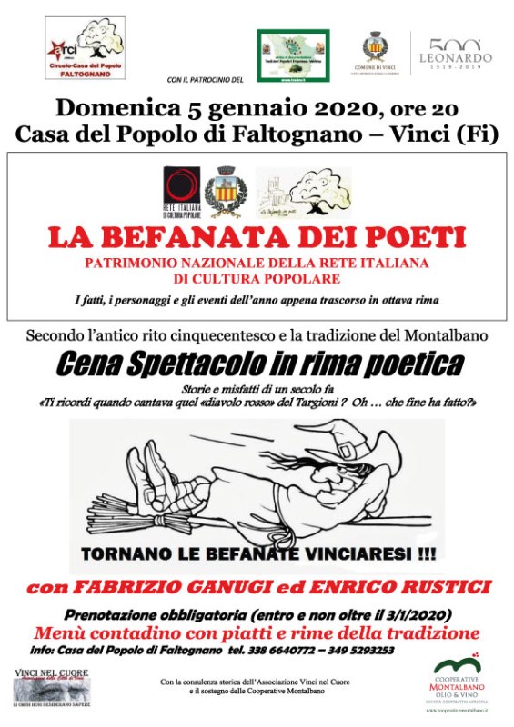 Domenica 5 gennaio 2020 alle ore 20, al Circolo di Faltognano (Vinci) si rievoca e organizza la veglia dell’Epifania: un’antica tradizione, plurisecolare, riscoperta qualche anno fa e rinnovata in una veste più adatta all’odierna sensibilità, dichiarata dal 2016 “Patrimonio Nazionale” della Rete Italiana di Cultura Popolare, istituzione fondata dal compianto prof. Tullio De Mauro. La candidatura da parte del Comune di Vinci, che patrocina l’evento, è nata dopo un attento studio della tradizione sul territorio nei suoi aspetti rituali: la cena e la veglia conviviale, la befanata come gioco di società in poesia secondo lo schema cinquecentesco delle “polizze”, ovvero i biglietti sui quali gli ospiti scrivono il nome e i temi proposti da sorteggiare per il canto della Befana, tradizione risalente addirittura all’Accademia degli Umidi (il più rinomato befanaro è stato il fiorentino Anton Francesco Grazzini detto il LASCA, NATO NEL 1505) Nella versione moderna è d’obbligo appuntare sulle polizze esclusivamente i nomi di personaggi pubblici e di eventi dell’anno passato, anziché i nomi dei commensali o dei personaggi della vita locale, come è stato negli ultimi secoli. Il canto della Befana (ovvero uno o più poeti) è improvvisato su di un piccolo teatrino allestito per l’occasione. Viene riproposta anche la tradizione dei cartelli, con la trascrizione delle befanate più belle, che restano appese per un anno presso il circolo di Faltognano. Una volta, invece, i cartelli venivano appesi la mattina del 6 gennaio nei punti di ritrovo delle varie frazioni, motivo di discussioni e di malumori, soprattutto per coloro che si vedevano protagonisti non consenzienti della rima satirica. Oggi i contrasti e i versi vengono ripresi e conservati nell’Archivio del Circolo ma soprattutto del Centro di documentazione delle Tradizioni Popolari dell’Empolese Valdelsa, altro importante partner organizzativo. Grazie al successo della rievocazione e all’attualizzazione la Befana lirica ormai abita per tutti al Circolo di Faltognano, alle pendici del Montalbano. Anche questo 5 gennaio attende tutti per “cantare” sui fatti e misfatti dell’anno appena trascorso:ottave rime, stornelli e canzoni ironiche bagnate dal buon vino delle Cooperative Olio&Vino Montalbano e alimentate dalla “cucina del tenente” e dei compari. La Befana quest’anno è rappresentata dai poeti canterini Enrico Rustici da BraccagniGrosseto e Fabrizio Ganugi da Prato che si cimenteranno sui temi sorteggiati e il canto o contrasto più bello, decretato dall’intensità degli applausi, determinerà la Befana dell’Anno (il titolo in passato è stato già vinto dal Papa, da Renzi e persino da Dario Fo!). Le rime vengono riprese e conservate gelosamente nell’archivio del Circolo di Faltognano e del Centro di Documentazione delle Tradizioni Popolari dell’Empolese Valdelsa. È d’obbligo la prenotazione direttamente presso il Circolo o ad uno dei seguenti numeri telefonici: 338/6640772 – 349/5293253 Come ogni anno l’evento si presta anche alla riscoperta di personaggi del passato. Questa è la volta di uno dei più discussi e contrastati poeti locali a cavallo dell’Ottocento e Novecento, Idalberto Targioni, esempio di tutte le contraddizioni novecentesche, seppure i suoi versi siano stati cantati fino ad oggi dai con il Patrocinio poeti improvvisatori, di cui il Centro spera di raccoglierne la memoria. L’Associazione Vinci nel Cuore presta la consulenza storica alla serata.