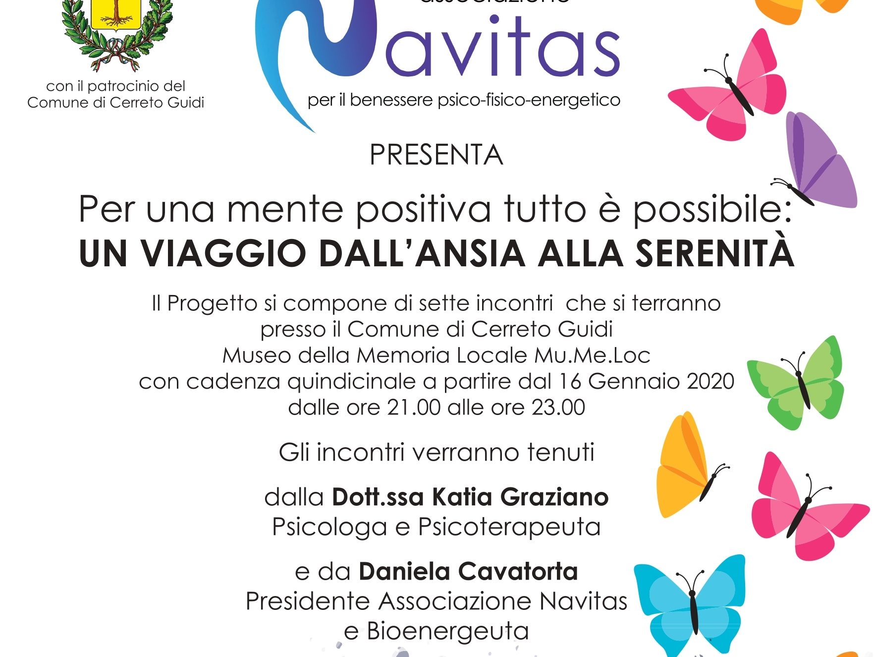 Sconfiggere lo stress con metodi appropriati. È l’obiettivo che si prefigge il progetto Per una mente positiva tutto è possibile: un viaggio dall’ansia alla serenità. Il progetto organizzato dall'Associazione Navitas per il benessere psico-fisico-energetico, ha lo scopo di far capire e conoscere lo stress quotidiano, a cui tutti noi ormai siamo esposti ed imparare a gestirlo attraverso 7 incontri serali a cadenza quindicinale che inizieranno giovedì 16 gennaio al MuMeLoc.