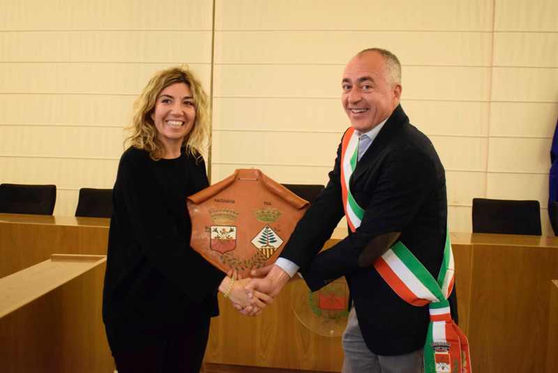 In compagnia del marito e della figlia e al termine di una vacanza in famiglia, la dottoressa Soria è stata accolta in Municipio dall’assessore alla cultura Michela Dell’Innocenti assieme al sindaco Alberto Coluccini e all’assessore Elisabetta Puccinelli. Un amichevole cambio di informazioni tra i due Comuni suggellata da una foto scattata all’interno della sala consiliare davanti la targa che celebra il gemellaggio tra il Comune toscano e quello catalano.