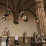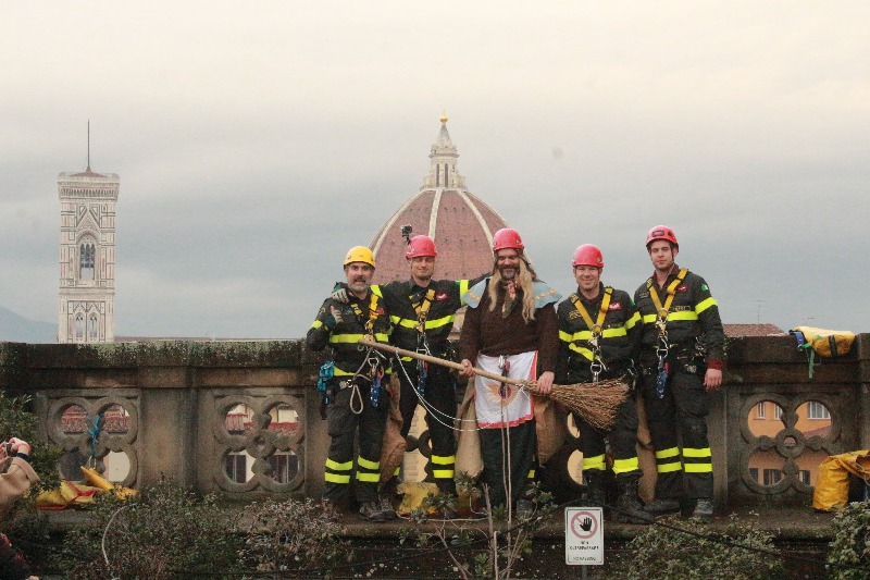 Firenze, la Befana dei vigili del fuoco vola su Piazza della Signoria e sul Meyer