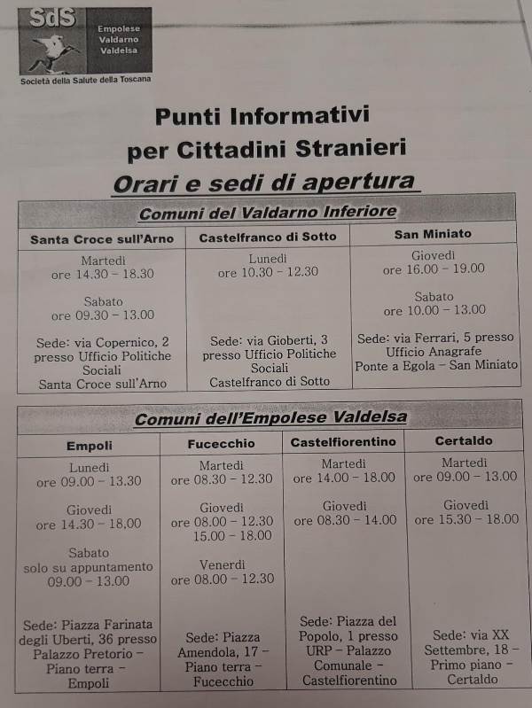 Per informazioni o per appuntamenti relativi alla compilazione delle pratiche: tel. 320.2569478 email: assistenzastranieri.valdarnoinferiore@uslcentro.toscana.it