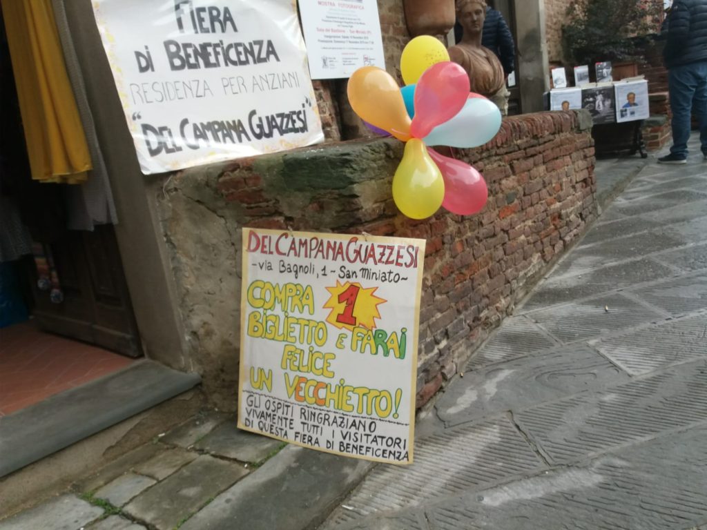 La struttura Del Campana Guazzesi intende cominciare l’anno facendo dei ringraziamenti ufficiali, in particolar modo la Direzione e Giovanna ringraziano di cuore Monsignor Andrea Migliavacca per aver messo a nostra disposizione una stanza per la realizzazione della nostra fiera di Beneficienza che viene allestita annualmente durante i giorni della mostra/ mercato del tartufo e il cui ricavato va alle attività di animazione extra della residenza. Un grazie particolare soprattutto agli esercizi commerciali che ci donano i premi da allottare e che sono: Oreficieria Fontanelli di San Miniato, Oreficeria Oro Moda di San Miniato basso, Oreficieria Gorini di Ponte a Egola, Macelleria Falaschi e Cantine Montalbano.