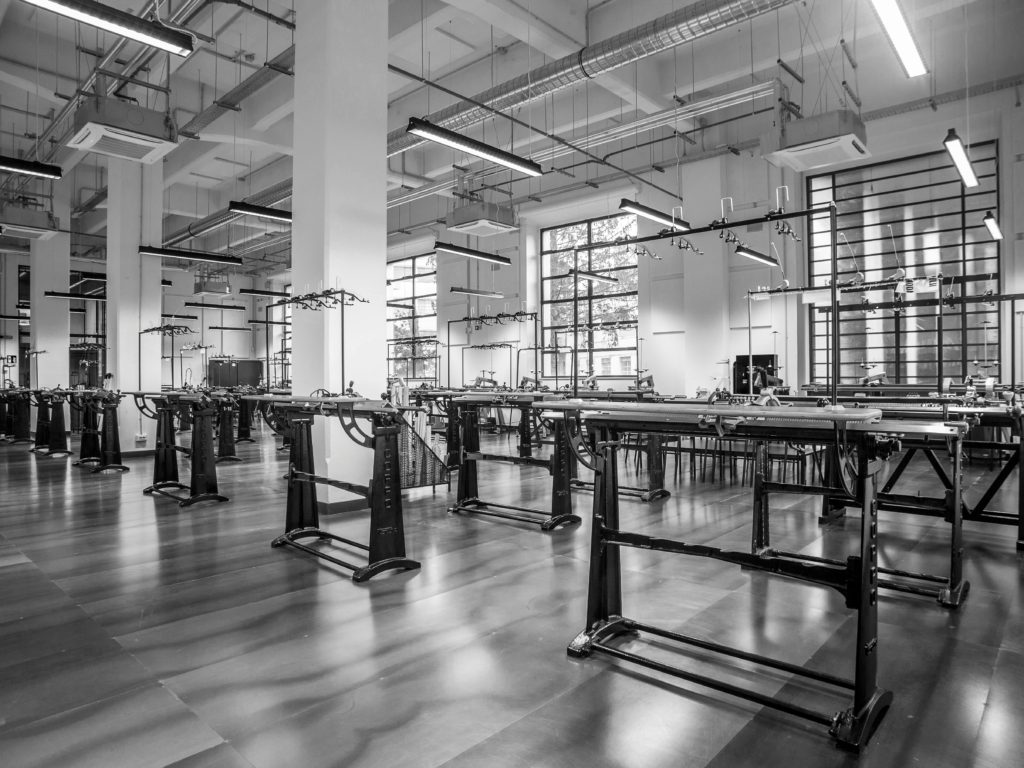 La nuova struttura Polimoda è infatti attrezzata con strumentazioni professionali di ultima generazione, per permettere agli studenti di operare in un ambiente che riproduce fedelmente la realtà dell’industria: 12 laboratori, 10 di confezione e 2 di maglieria, e un intero piano open space dedicato alla confezione e allo studio delle collezioni degli studenti dell’ultimo anno, equipaggiati con macchine piane, taglia e cuci e macchine specifiche per le lavorazioni sartoriali, oltre a piani stiro in ogni laboratorio, telai per la maglieria, rimagliatrici e manichini sartoriali di diverse taglie e tipologie.