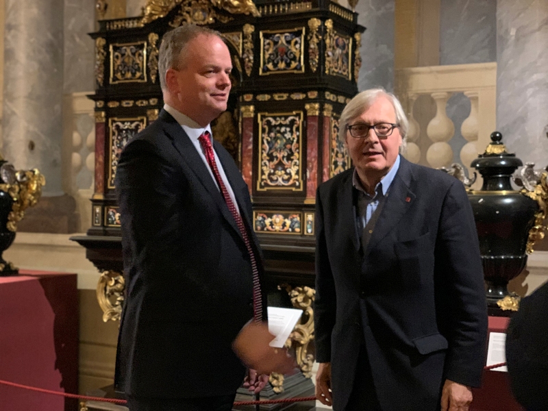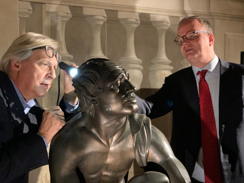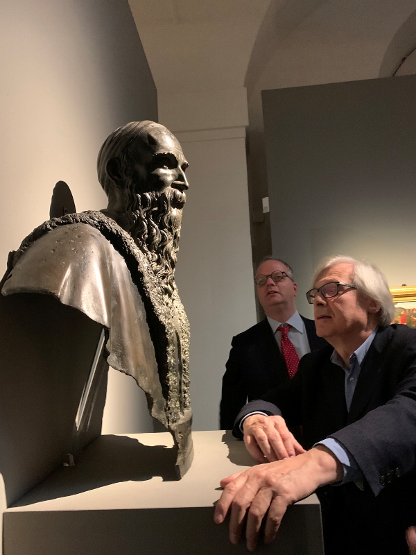 Vittorio Sgarbi in visita alle mostre di Palazzo Pitti e degli Uffizi. Lo storico dell’arte, ieri pomeriggio a Firenze, è stato accolto dal direttore Eike Schmidt che ha fatto gli onori di casa e l’ha guidato per un tour di due ore tra le esposizioni Plasmato dal fuoco. La scultura in bronzo nella Firenze degli ultimi Medici al Tesoro dei Granduchi di Palazzo Pitti e Pietro Aretino e l’arte nel Rinascimento nell’aula Magliabechiana degli Uffizi. Il critico d’arte ha salutato i dipendenti incrociati lungo il percorso e ammirato le sculture in bronzo di Massimiliano Soldani Benzi, di Giovan Battista Foggini, Pietro Tacca e del Giambologna. Sgarbi è rimasto piacevolmente colpito dalla mostra che chiuderà il prossimo 12 gennaio e vanta più di cento prestiti internazionali.