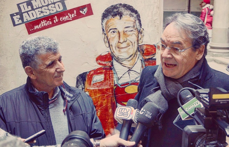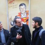 Oggi un’altra tappa della prima serie delle “apparizioni” dei #superhumans sui muri di Firenze con la presenza di Pietro Bartolo, medico di Lampedusa ed europarlamentare che ha visitato l’installazione che lo ritrae con la tuta da superhuman, l’occhiolino e il giubbotto di salvataggio rosso. Il muro ed il murales di Pietro Bartolo si trovano nel Cortile di Palazzo Strozzi, che nel 2016 aveva ospitato sulla facciata i gommoni di Ai Weiwei, monito contro la strage continua dei migranti nel Mediterraneo. Oggi nel Cortile, insieme al muro, c’erano anche funi e giubbotti di salvataggio, per evocare quello che succede ogni giorno davanti alle nostre coste. L’installazione durerà 24 ore e poi verrà rimossa dal Cortile di Palazzo Strozzi per essere portata in altre piazze di Firenze, mentre il murales di Bartolo in via della Spada resterà: un giubbotto di salvataggio rosso che spicca fra le vie dello shopping.