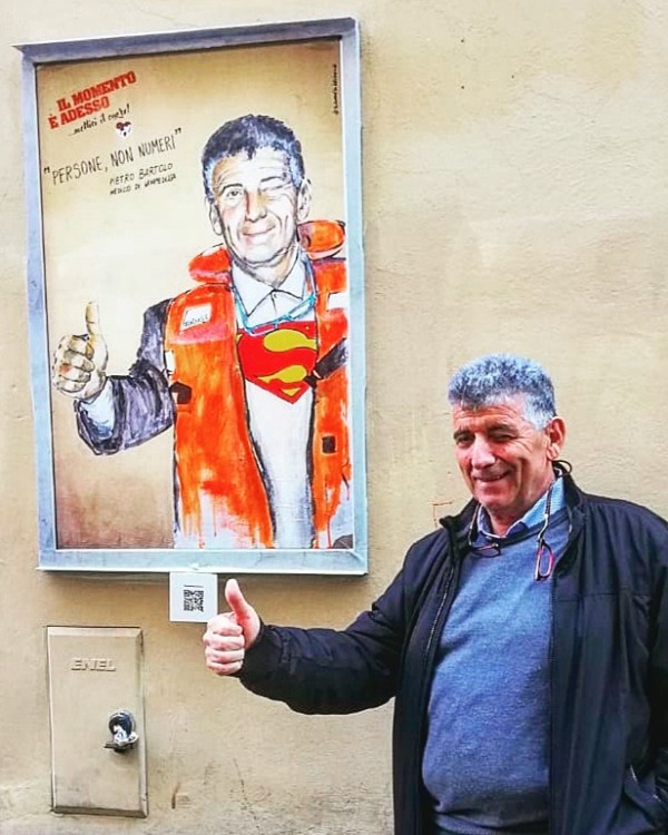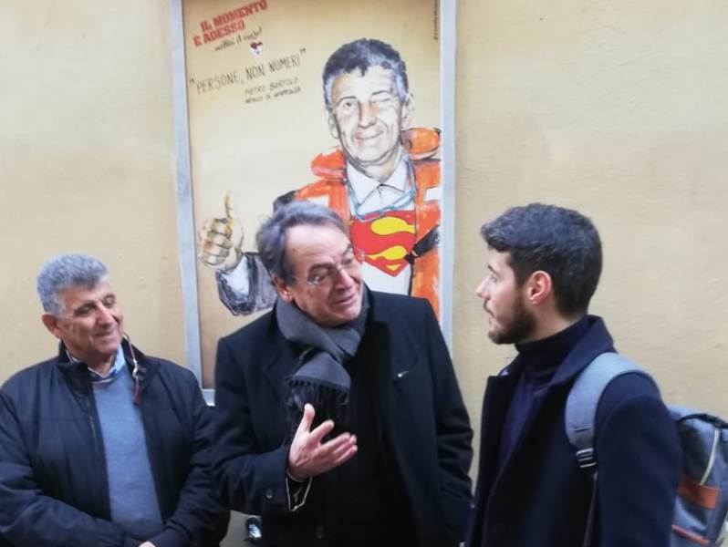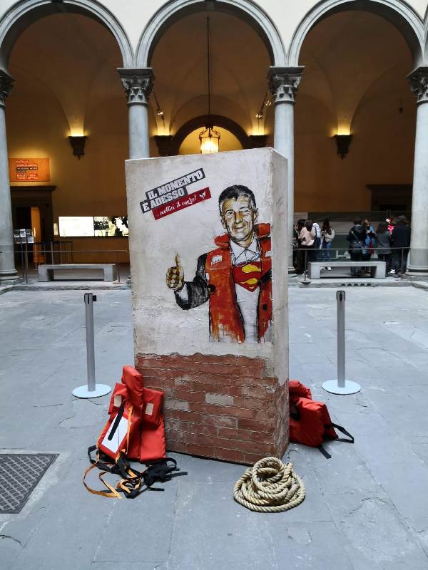 Oggi un’altra tappa della prima serie delle “apparizioni” dei #superhumans sui muri di Firenze con la presenza di Pietro Bartolo, medico di Lampedusa ed europarlamentare che ha visitato l’installazione che lo ritrae con la tuta da superhuman, l’occhiolino e il giubbotto di salvataggio rosso. Il muro ed il murales di Pietro Bartolo si trovano nel Cortile di Palazzo Strozzi, che nel 2016 aveva ospitato sulla facciata i gommoni di Ai Weiwei, monito contro la strage continua dei migranti nel Mediterraneo. Oggi nel Cortile, insieme al muro, c’erano anche funi e giubbotti di salvataggio, per evocare quello che succede ogni giorno davanti alle nostre coste. L’installazione durerà 24 ore e poi verrà rimossa dal Cortile di Palazzo Strozzi per essere portata in altre piazze di Firenze, mentre il murales di Bartolo in via della Spada resterà: un giubbotto di salvataggio rosso che spicca fra le vie dello shopping.