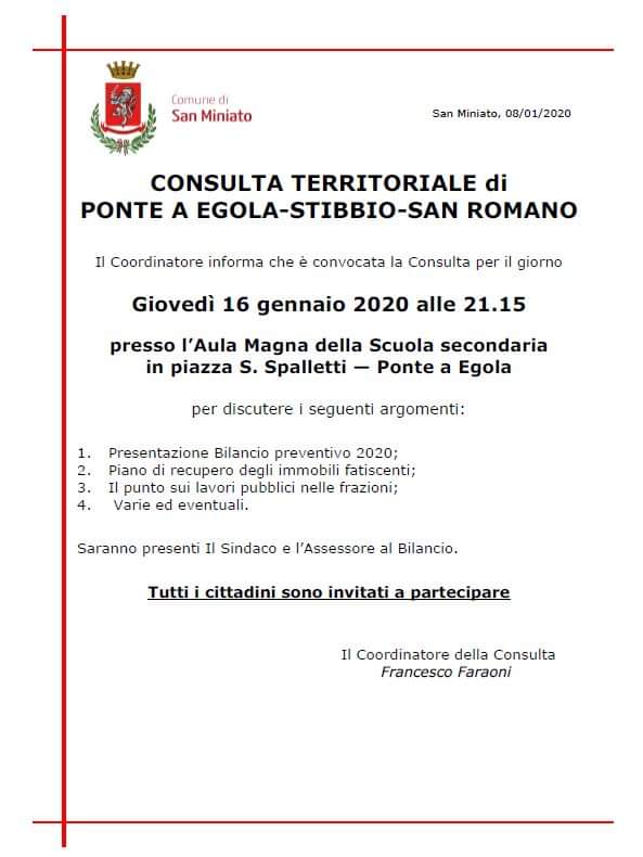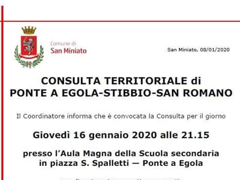 È stata convocata la Consulta Territoriale a Ponte a Egola-Stibbio-San Romano per il giorno giovedì 16 gennaio alle 21.15 presso l’Aula Magna della Scuola secondaria in piazza Spalletti a Ponte a Egola.