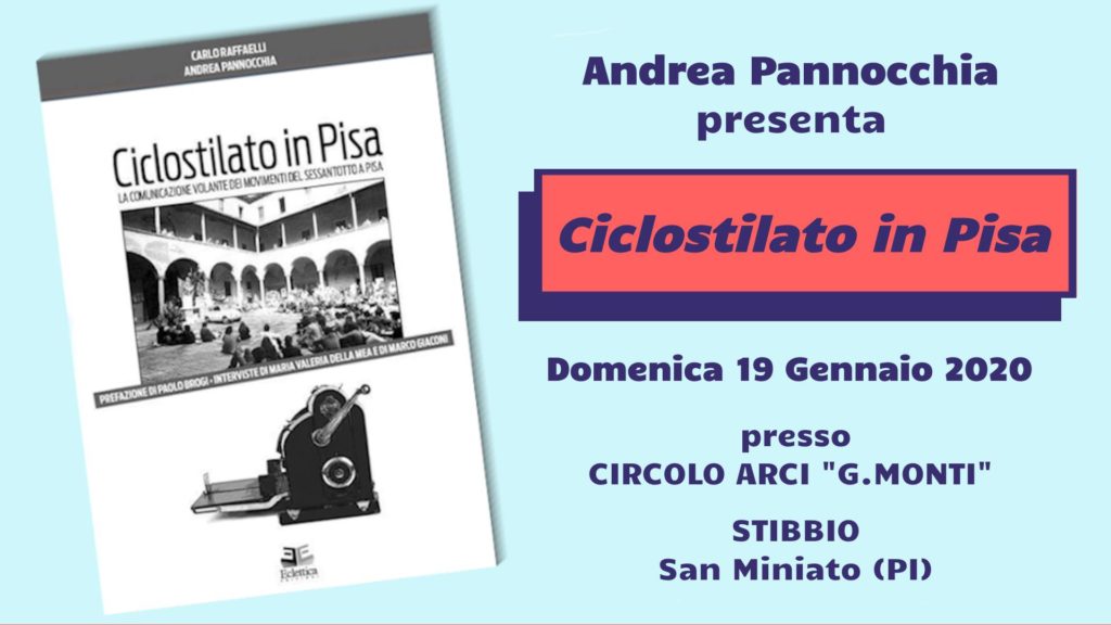 Domenica 19 gennaio il Circolo G.Monti di Stibbio è lieto di ospitare, in concomitanza col classico aperitivo, la presentazione del libro "Ciclostilato in Pisa-La comunicazione volante dei movimenti del sessantotto a Pisa" di Carlo Raffaelli (esperto di comunicazione e formatore PNL) e Andrea Pannocchia (giornalista e sociologo della comunicazione).