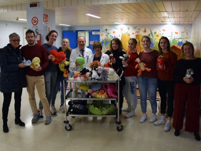 Si chiama Teddy bear toss ed è un momento molto coinvolgente e piacevole che anima gli eventi natalizi degli sport americani: il pubblico, ad un momento prestabilito, effettua un lancio collettivo di peluches che, una volta finiti in campo, vengono raccolti e consegnati ai reparti pediatrici degli ospedali della zona. A Siena, la stessa iniziativa ha visto protagonista la squadra di basket del Costone femminile in occasione della partita interna con San Giovanni Valdarno del 22 dicembre scorso. Nel pomeriggio di martedì 14 gennaio, una delegazione del Costone femminile si è recata al policlinico Santa Maria alle Scotte per consegnare e donare i peluches raccolti al Dipartimento della Donna e dei Bambini dell’Azienda ospedaliero-universitaria Senese. A fare gli onori di casa il professor Mario Messina, direttore del Dipartimento e della UOC Chirurgia pediatrica, insieme alla coordinatrice infermieristica Giuliana Masiero.