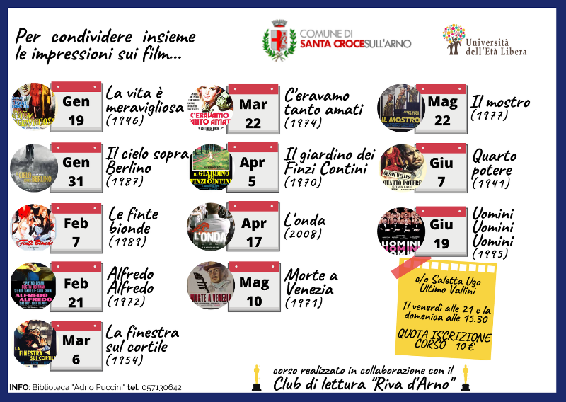 Si tratta di una nuova iniziativa dell'Università dell'Età Libera, un vero e proprio corso per approfondire la conoscenza di film più o meno famosi della storia del cinema italiano e internazionale.