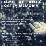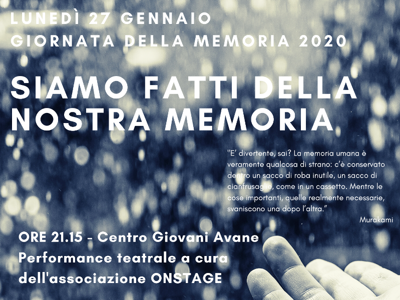 I due incontri prevedono un lavoro corporeo ed emotivo per preparare i ragazzi e le ragazze alla Giornata della Memoria e chi vorrà potrà essere parte dello spettacolo teatrale dal titolo “Siamo fatti della nostra memoria”. La performance realizzata dal gruppo teatrale Onstage si svolgerà infatti al Centro Giovani di Avane alle 21.15 proprio il 27 gennaio, in occasione della giornata internazionale nata per commemorare le vittime dell'Olocausto.