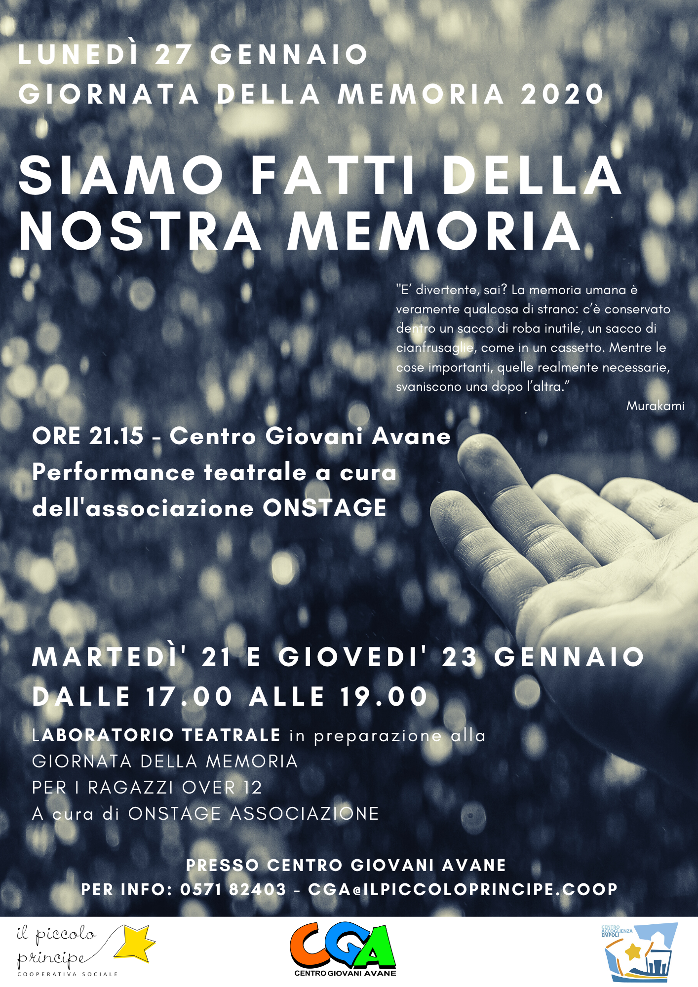 La giornata della memoria 2020 si avvicina. Per questo il Centro Giovani di Avane ha organizzato, insieme all’associazione Onstage, un laboratorio teatrale rivolto a ragazze e ragazzi over 12 che si svolgerà nei locali del Cga (Via di Magolo 32) il 21-23 Gennaio dalle 17 alle 19.