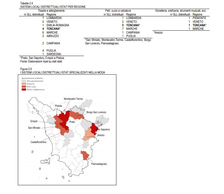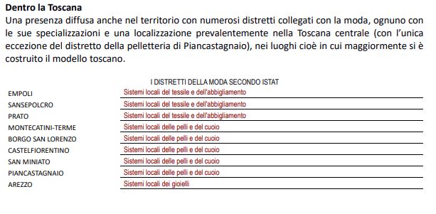 Una presenza diffusa anche nel territorio con numerosi distretti collegati con la moda, ognuno con le sue specializzazioni e una localizzazione prevalentemente nella Toscana centrale (con l’unica eccezione del distretto della pelletteria di Piancastagnaio), nei luoghi cioè in cui maggiormente si è costruito il modello toscano.