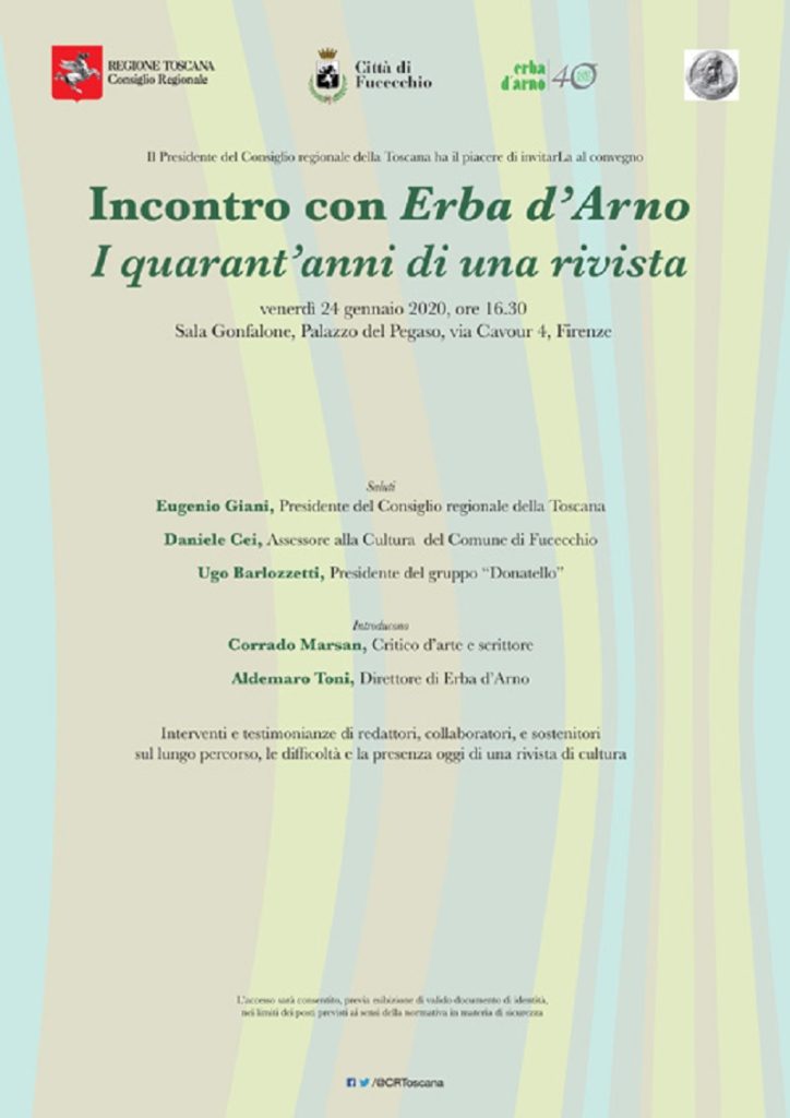 La rivista Erba d'Arno, edita dalla storica casa editrice fucecchiese 'Edizioni dell'Erba', festeggia i 40 anni di attività. E lo farà venerdì prossimo 24 gennaio a Firenze con un'iniziativa presso il Palazzo del Pegaso in via Cavour.