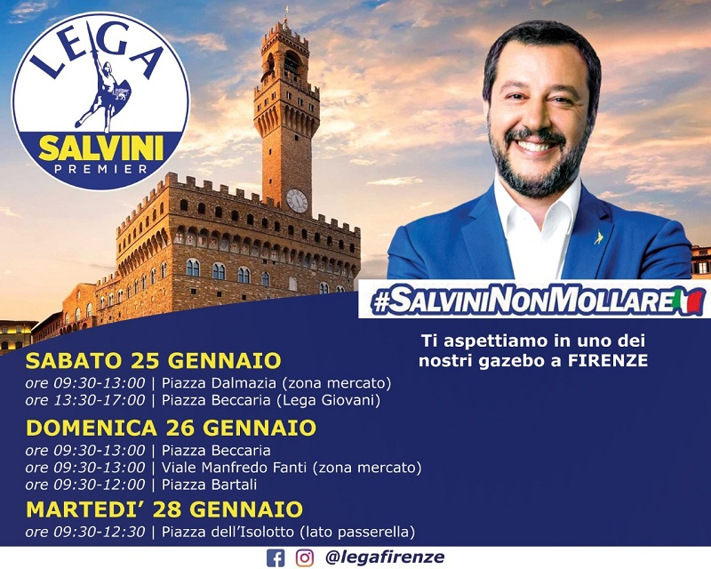 " Sabato 25 e domenica 26 gennaio sarà possibile recarsi presso i gazebo organizzati dalla Lega di Firenze per sottoscrivere la  campagna " Ripuliamo Firenze, Nardella a casa"; un grande momento di confronto e di incontro con la cittadinanza, per una seria riflessione sulle condizioni nelle quali è stata ridotta Firenze, dalla sconsideratezza dell'amministrazione attuale".