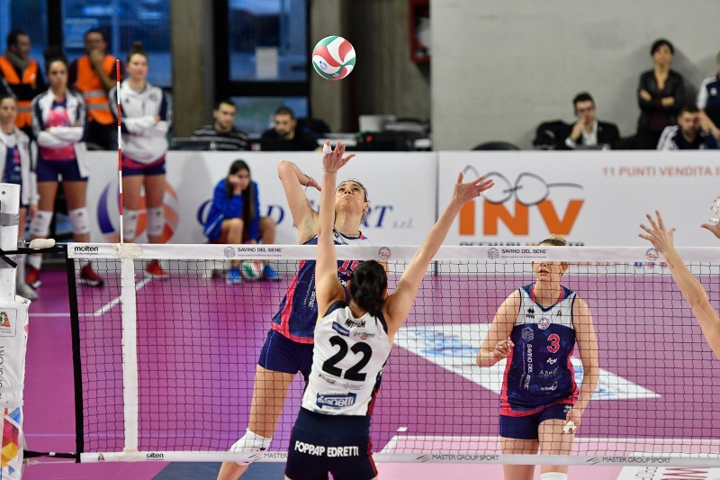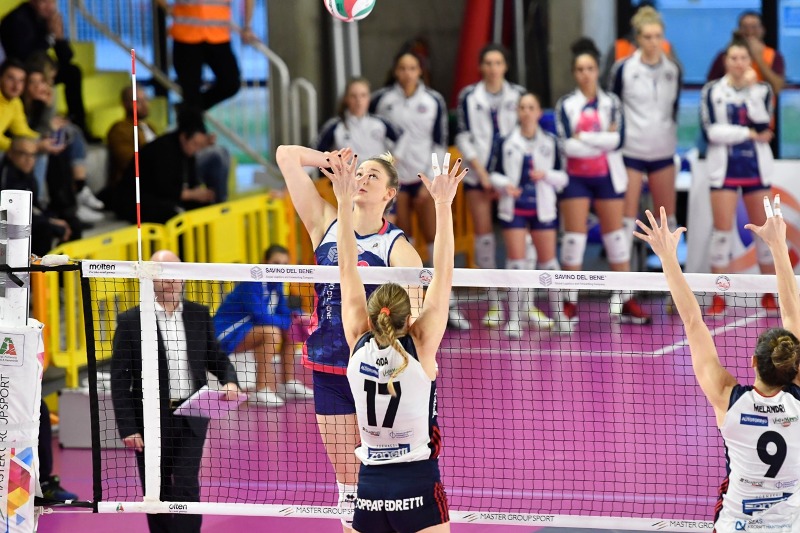 Fenoglio risponde con Mirkovic-Smarzek, la doppia coppia di ex schiacciatrici Mitchem-Loda, Olivotto e Melandri come centrali e Sirressi come libero.