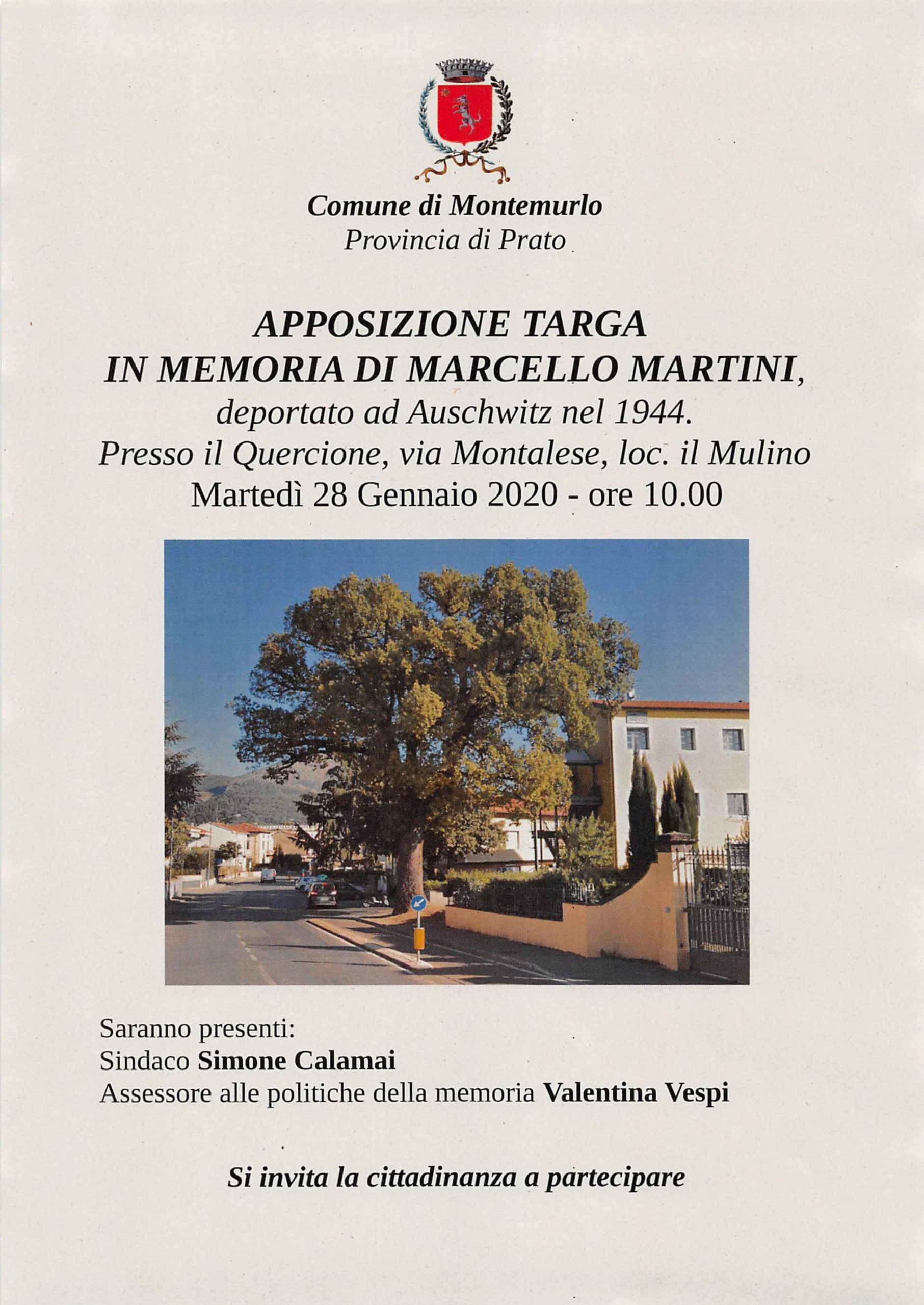 Le celebrazioni del Giorno della Memoria a Montemurlo si chiudono domattina, martedì 28 gennaio, ore 10 al Quercione di via Montalese in località Il Mulino con l'apposizione di una targa in ricordo di Marcello Martini che proprio qui nel 1944, all'età di 14 anni, fu arrestato dai nazi-fascisti e deportato nel campo di sterminio di Mauthausen in Austria. Marcello Martini è dal 2015 cittadino onorario di Montemurlo ed è scomparso lo scorso 14 agosto all'età di 89 anni. Martini, come tantissimi altri sopravvissuti alla deportazione, ha dedicato la sua vita alla testimonianza e al racconto di quella terribile discesa all'inferno ed è stato autore del libro “Un adolescente in lager. Ciò che gli occhi tuoi hanno visto”.