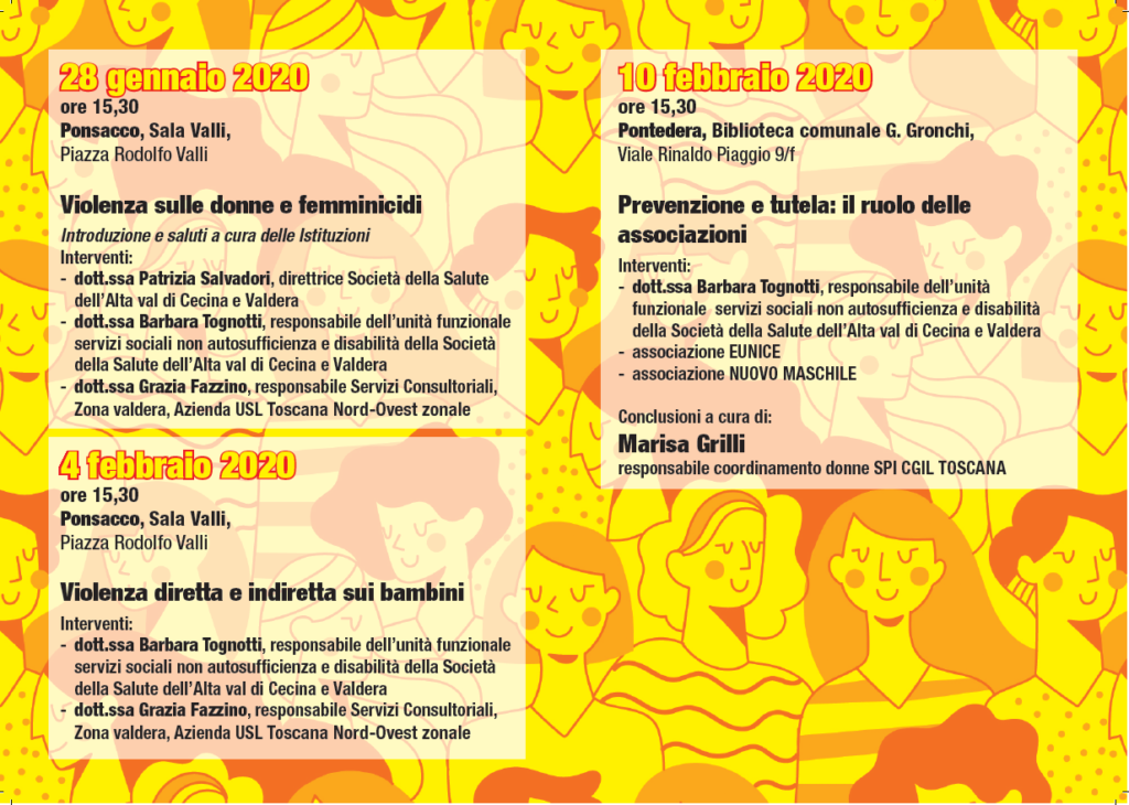 Parte martedì 28 Gennaio a Ponsacco il ciclo di incontri e conversazioni sul tema della violenza contro le donne e contro i bambini. L’iniziativa è organizzata da SPI CGIL Pisa Coordinamento delle Donne, in collaborazione con Asl Toscana Nord Ovest, Società della Salute Valdera-Alta Val di Cecina, Auser Ponsacco, Università della Terza Età Ponsacco, Biblioteca Giovanni Gronchi Pontedera, con il patrocinio del Comuni di Ponsacco e Pontedera, e con la partecipazione delle Associazioni Eunice e Nuovo Maschile.