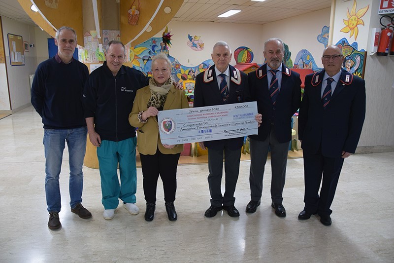 Bellissimo gesto di generosità da parte dell’Associazione Nazionale Carabinieri di Castellina e Radda nel Chianti, che ha effettuato una donazione all’ATL Siena Onlus per il Dipartimento della Donna e dei Bambini dell’Azienda ospedaliero-universitaria Senese. La somma donata è il ricavato di un concerto che si è tenuto nel mese di dicembre ed il presidente dell’Associazione, il vice brigadiere in congedo Beniamino De Gaetano, alla presenza del comandante provinciale dei Carabinieri di Siena, colonnello Stefano Di Pace, ha consegnato l’assegno a Katia Landi e Francesco Anichini, rispettivamente presidente e vice presidente dell’ATL Siena Onlus, al professor Mario Messina, direttore del Dipartimento della Donna e dei Bambini, al professor Salvatore Grosso, direttore della Pediatria, e alla coordinatrice infermieristica Giuliana Masiero. «Per il quarto anno consecutivo diamo un nostro contributo per i bambini ricoverati alle Scotte, – dichiara il vice brigadiere in congedo De Gaetano - in questa occasione abbiamo consegnato un assegno all’Associazione Toscana contro le Leucemie e i tumori del bambino, che sarà a disposizione dei piccoli pazienti». Per Katia Landi, presidente Atl Siena Onlus si tratta di «un gesto lodevole, per il quale è giusto ringraziare l’Arma dei Carabinieri. L’Atl opera all’interno della Pediatria ed in particolare dell’oncoematologia pediatrica da oltre 40 anni, siamo felici di portare avanti la nostra attività, è proprio con questi gesti di generosità che riusciamo a portare avanti i sogni e i desideri dei nostri ragazzi». Il colonnello Stefano Di Pace, comandante provinciale dei Carabinieri di Siena, ricorda come «la professione e l’operato dei Carabinieri non siano solamente fatti d’armi, gli aspetti più importanti riguardano proprio questi atti di generosità, testimonianza della vicinanza verso i piccoli pazienti dell’Azienda ospedaliero-universitaria Senese».