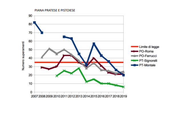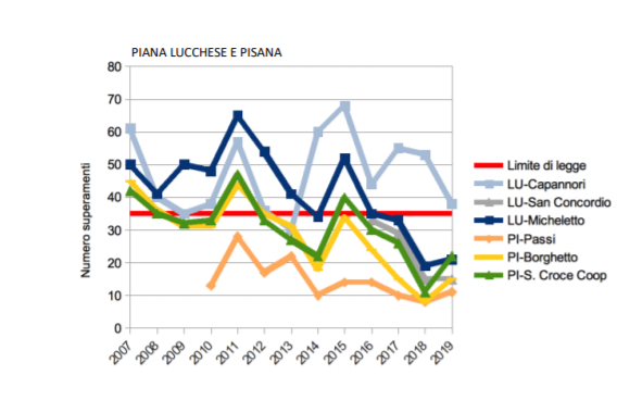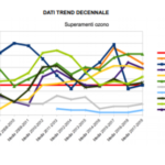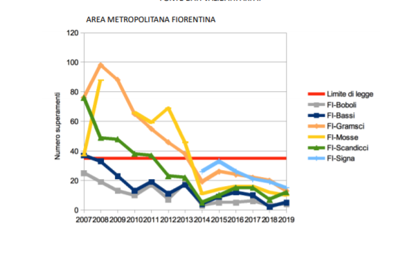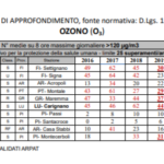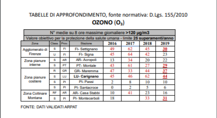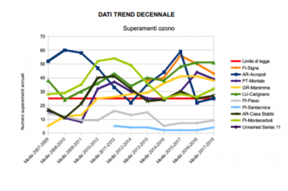Per l’ozono troposferico, un inquinante tipicamente estivo il cui limite previsto dalla legge è di 25 giorni all’anno con una concentrazione superiore a 120 microgrammi/metro cubo (calcolato sulla media mobile delle 8 ore), nel 2019 sono state ben 5 le aree che hanno superato il limite dei 25 giorni: Lucca con 44 giorni di sforamento, Grosseto Maremma 37, Firenze Settignano 30, Montecerboli (PI) con 31 e Montale 29. Come risulta evidente dai dati delle tabelle allegate, i valori di concentrazione di ozono in Toscana si sono mantenuti elevati e critici per tutto il decennio. L’andamento degli indicatori calcolati sui dati di ozono non mostra cioè un trend preciso ma indica un costante superamento del valore obiettivo in gran parte della regione.