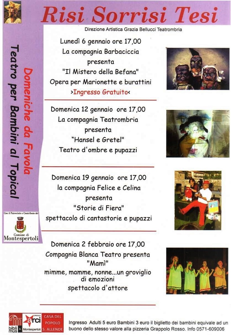 Domenica 2 febbraio alle ore 17 presso la Sala Topical del Circolo Arci-Casa del Popolo di Montespertoli è in programma l'ultimo appuntamento con le "domeniche da favola".