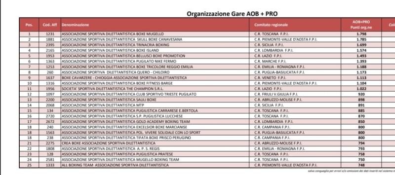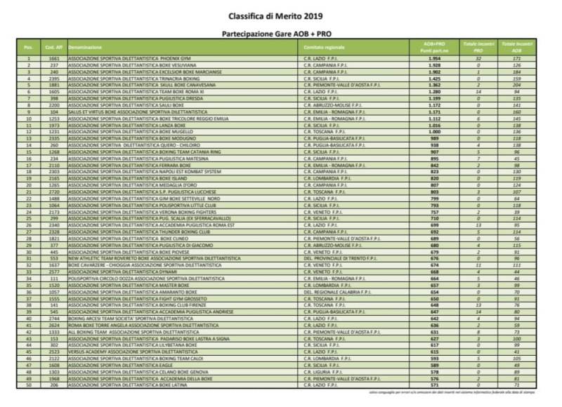 Di rilievo assoluto anche il risultato nell’altrettanto importante graduatoria “Partecipazione gare”, ovvero la classifica formata sulla base dei risultati ottenuti dagli atleti: la società mugellana, con i suoi 1.000 punti e i 136 incontri disputati dai suoi ragazzi, è la prima in Toscana e la dodicesima in Italia – su oltre 800 – preceduta soltanto da mostri sacri della boxe italiana come la Boxe Marcianise, la Boxe Canavesana e la Pugilistica Dresda.
