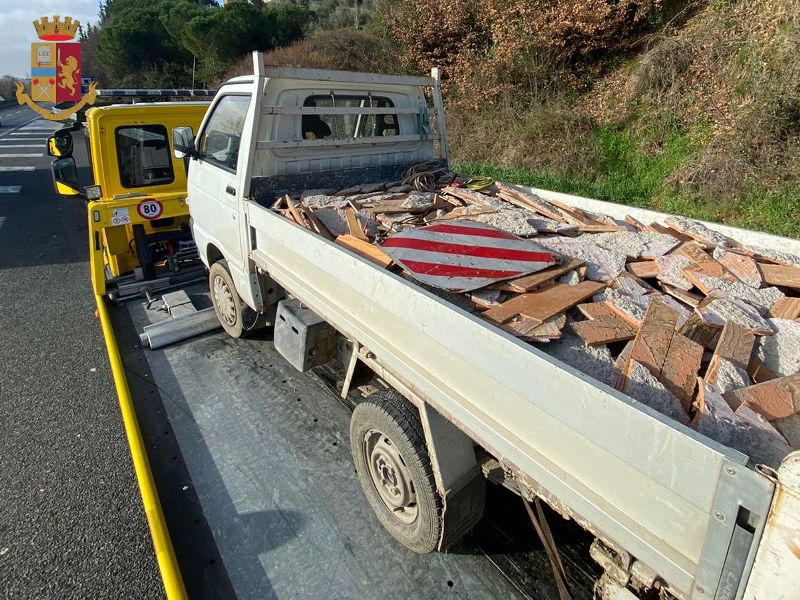 Durante il servizio una pattuglia della Polizia Stradale ha soccorso anche un muratore di 43 anni, originario dell’Albania, che proprio in quella zona era stato lasciato in panne dal suo autocarro guasto. Gli agenti della Polizia Stradale si sono fermati per soccorrerlo e per segnalare l’ostacolo ai veicoli che sopraggiungevano, riuscendo così a metterlo in sicurezza presso una piazzola adiacente, in attesa del carro attrezzi. Nel frattempo i poliziotti hanno controllato il mezzo che stava trasportando un carico di macerie, scoprendo che non era autorizzato. L’uomo non era iscritto nell’apposito albo ed avrebbe verosimilmente potuto di liberarsi di quei detriti chissà dove, senza preoccuparsi per l’ambiente. A causa di tale leggerezza gli è stato sequestrato il mezzo e dovrà pagare circa 3.000 euro di multa, oltre che smaltire correttamente il carico di mattoni.