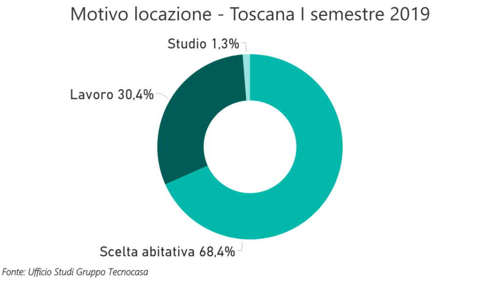 L'analisi condotta dall'Ufficio Studi del Gruppo Tecnocasa sui contratti di locazione stipulati attraverso le agenzie Tecnocasa e Tecnorete nel primo semestre 2019 in Toscana, evidenzia che nella maggioranza dei casi si opta per l'affitto per scelta abitativa (68,4%). Una buona parte, ovvero il 30,4% lo fa per motivi di lavoro e il restante 1,3% per motivi di studio.
