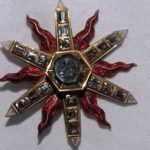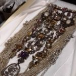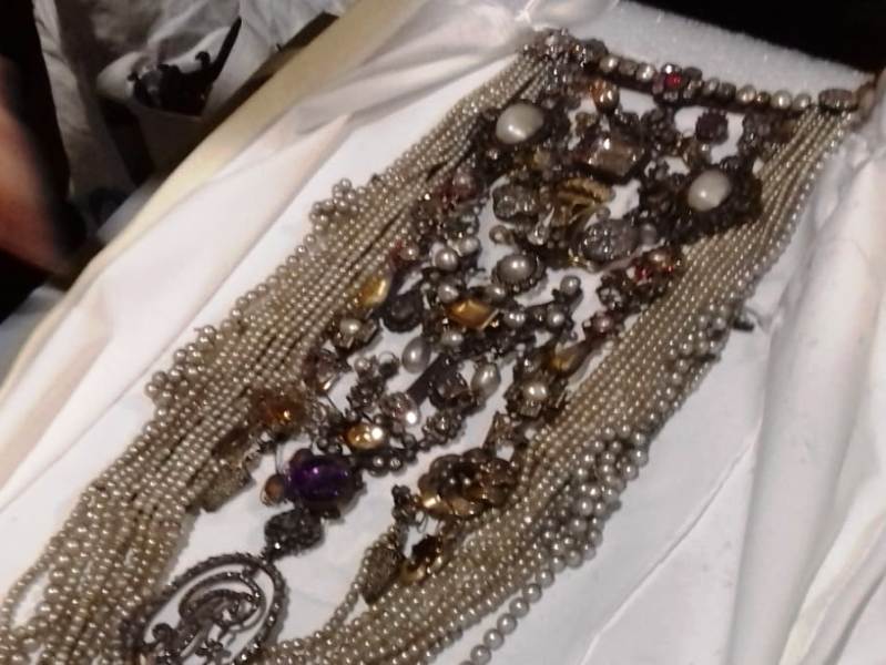 Il collier, nella sua configurazione attuale, si è definito nel corso dei secoli a seguito dei donativi delle granduchesse, dei padri Serviti e di altri fedeli, e contestualmente si è andato nel tempo modificando in ragione dell’inserimento di nuove gioie sotto forma di fili di perle, spille, pendenti e anelli, con accrescimenti, adattamenti, ma anche con sostituzione delle singole gioie, in alcune casi smontate per adattare le pietre preziose a nuovi gioielli. Ricostruire datazione e provenienza dei singoli elementi risulta quindi allo stato attuale (e osservando l’insieme nell’odierno assemblaggio) oltremodo complesso. Appare tuttavia chiaramente identificabile il gioiello donato nel novembre del 1687 dalla granduchessa Vittoria della Rovere, opera dell’orafo e gioielliere di corte Giovanni Comparini, caratterizzato al centro da un topazio orientale quadrato, dettagliatamente descritto dalle fonti archivistiche (Tozzi 1765, Tonini 1876) e successivamente adattato ad altre gioie a costituire parte della barra verticale centrale del collier. Il collier, così come la collana, non è applicato sull’affresco ma forma un tutt’uno sostenuto da una barra superiore che si aggancia sul montante laterale destro della cristalliera.