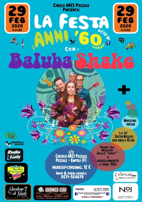 Sabato 29 febbraio dalle h 21:00 si inizia con "Moscato D.J." che mixerà usando rigorosamente vinili d'epoca a 45 giri. Alle 22:00 il concerto dei Baluba Shake, la più nota '60s band toscana , con un repertorio tutto da ballare per scatenarsi al ritmo di twist, shake, beat & surf!