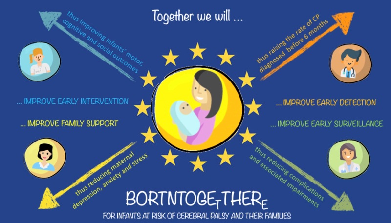 Il Progetto: obiettivi e Linee Guida . “BornToGetThere” si pone l’obiettivo di migliorare i programmi sanitari per la diagnosi e la sorveglianza precoci delle menomazioni associate nei neonati con paralisi cerebrale. Da un lato, da un lato mira a favorire l’erogazione personalizzata di interventi precoci e la prevenzione delle complicanze secondarie per i neonati e, dall’altra, un efficace sostegno ai genitori.