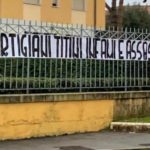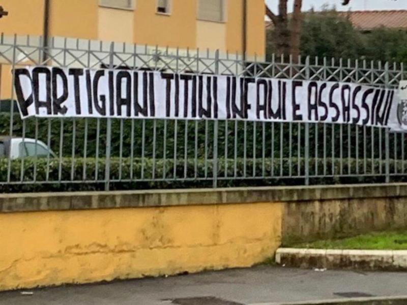 Questo striscione riportava una frase dal linguaggio riconducibile ad organizzazioni di estrema destra, relativi alla giornata del ricordo.