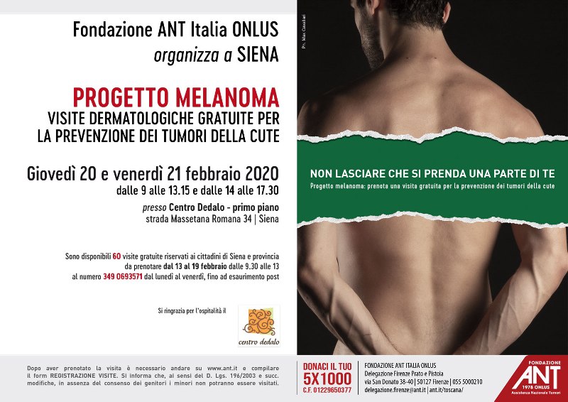 Con l’inizio del nuovo anno, Fondazione ANT porta nuovamente a Siena il Progetto Melanoma ANT. Con il PROGETTO MELANOMA, Fondazione ANT offre visite dermatologiche con l’ausilio della dermatoscopia per la diagnosi tempestiva di lesioni sospette e/o neoplastiche, ai cittadini. Il progetto si colloca nell’ambito delle campagne di prevenzione oncologica gratuita che Fondazione ANT ha attivato in tutta Italia fin dal 2004 e in Toscana a partire dal 2007.