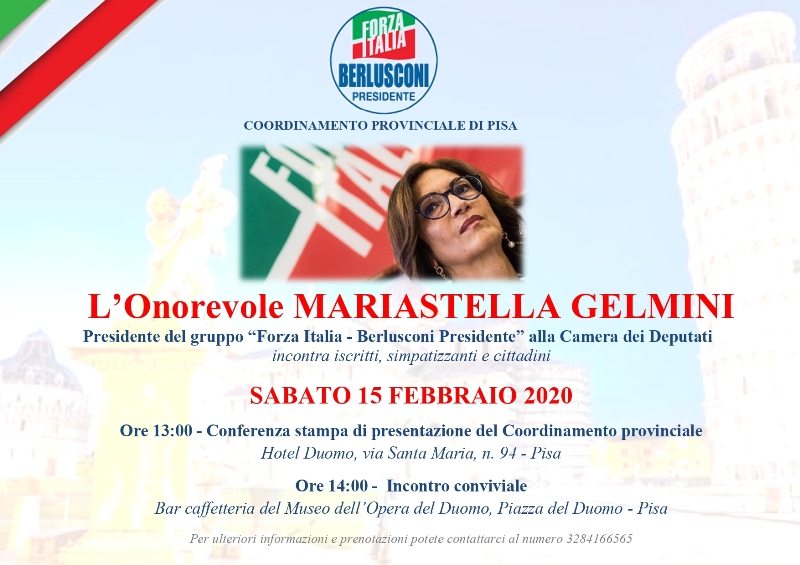 Sabato 15 febbraio p.v., l’Onorevole Mariastella Gelmini, Presidente del gruppo “Forza Italia - Berlusconi Presidente” alla Camera dei Deputati, sarà a Pisa per incontrare iscritti, simpatizzanti e cittadini.