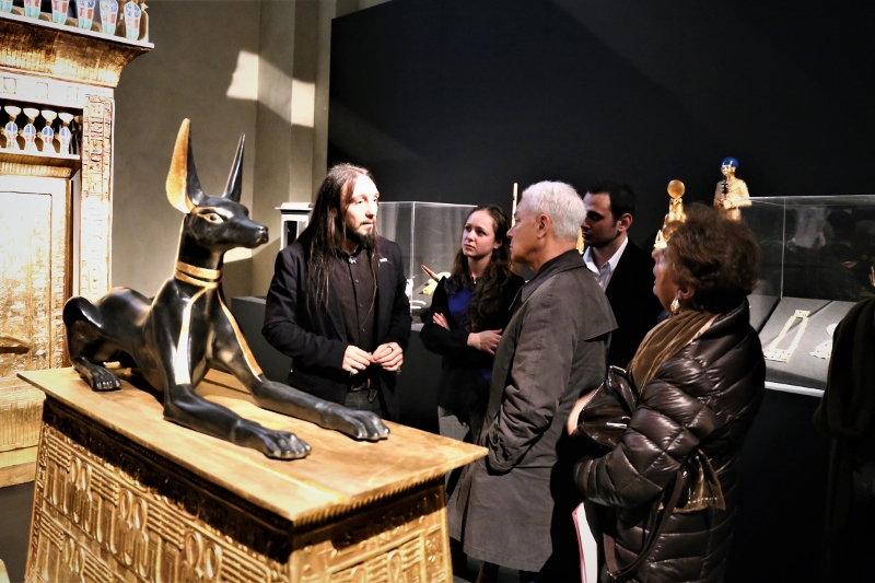 A consentirne la ricostruzione in mostra, numerose riproduzioni, tra cui, oltre ai vasi canopi, la statua di Anubis, con la funzione di proteggere la camera del tesoro; il trono d’oro e la meravigliosa maschera aurea che proteggeva il volto e le spalle della mummia.